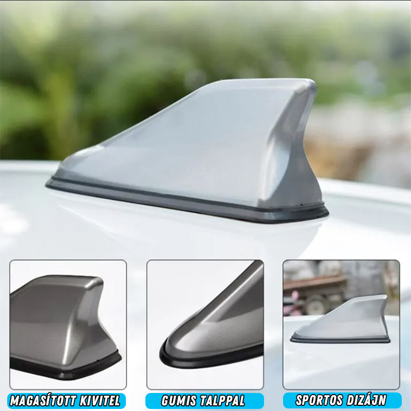Legújabb kivitelű cápauszony antenna, amelynek a kialakítása magasított és a talpa gumírozott kialakítású.