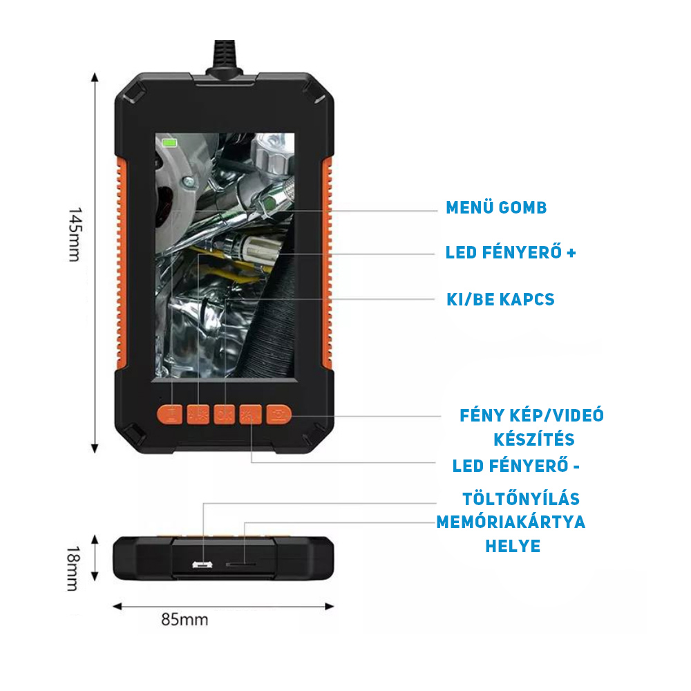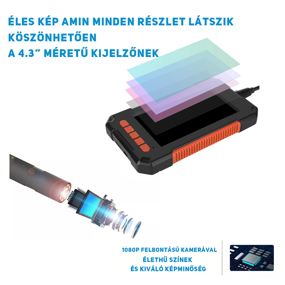 A maximálisan támogatott 1920×1080 pixeles felbontással az endoszkóp kamera tiszta fényképeket készít és kiváló minőségű videókat rögzít. A 4,3″-os színes LCD-képernyő lehetővé teszi az élő videók megtekintését a vizsgálat során.