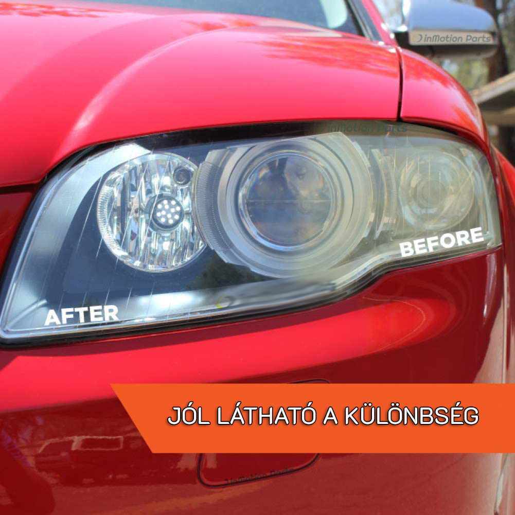 Szerintem szuper! Nagyon tetszett a hozzáadott ragasztócsíkos takarófólia, pedig nagy reményeket nem fűztem hozzá. A csiszolókészlet-paszta és UV védő 2 autóhoz is elég, ha nem túl nagyok a lámpák.