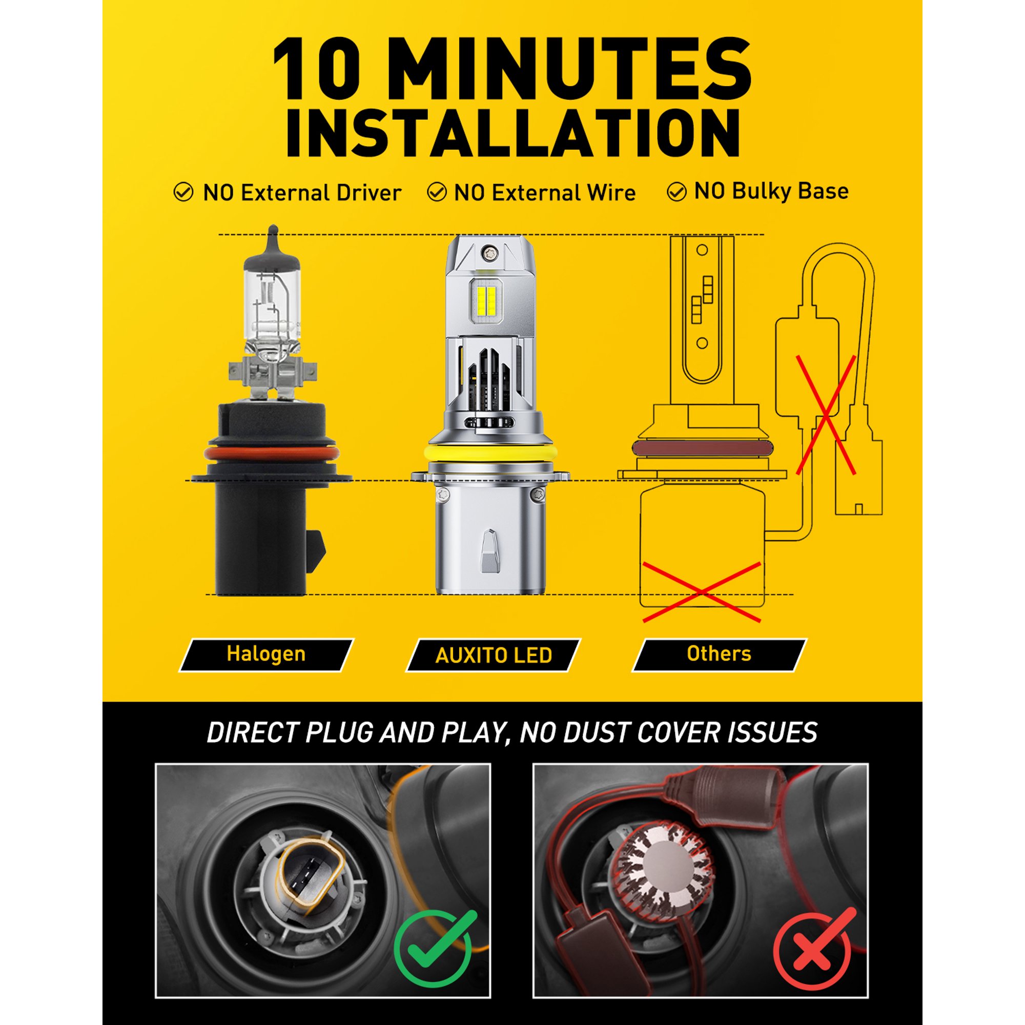 • Telepítés: Az izzók teljesen az egyben kialakításúak, nincs külső meghajtó vagy vezeték, és nem polaritású dugók, amelyek könnyen telepíthetők. Egyszerűen csatlakoztassa az izzókat közvetlenül az autós aljzatba, akárcsak a halogén izzókat. Ezek a 9007-es izzók 1-1 helyettesítői az OEM halogén izzóknak, így egyszerűen beszerelhetők.