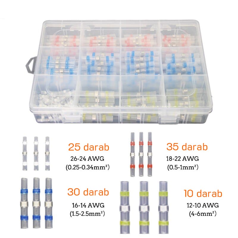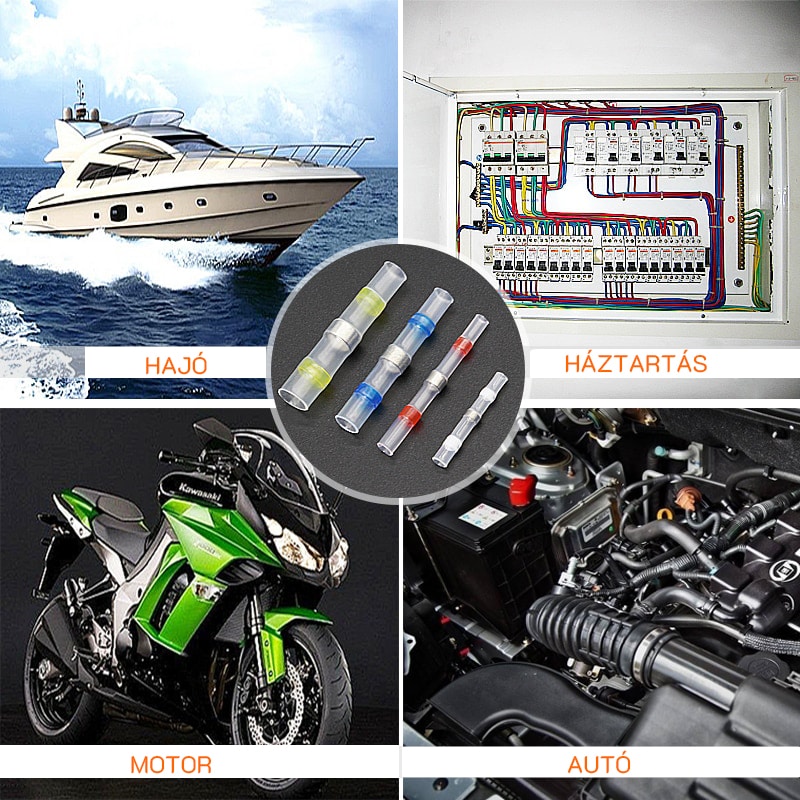 Hőzsugorcső fém betéttel összekötő hüvely 100db A hagyományos hőzsugorcsövekkel ellentétben ez a típus egy műanyag külsővel és belső óngyűrűkkel rendelkezik. Hőre összeszűkül a műanyag burkolat, a belső ón pedig megolvad így teljes csatlakozást és vízálló kötést biztosít. Egy művelet során történik meg a vezetékek összekötése, forrasztása, szigetelése és tömítése. A zsugorcső átlátszó falának köszönhetően a kapcsolat szabad szemmel is ellenőrizhető. Gyors és profi megoldás a vezetékek szigetelésére. A használatához nincs szükség krimpelő fogóra vagy egyéb speciális szerszámra, egyszerűen hő hatására összezár a műanyagburkolat és a fém belső gyűrűk. A duplafalu kialakításának köszönhetően a vezetékek nem tudnak kicsúszni a kötéseből, így biztonságosan használható minden területen. A zsugorcső szett tárolódobozba van csomagolva méret szerint. A méreteket a színek is meghatározzák, így nem kell keresgélni a csomagban, azonnal kéznél lesz a megfelelő méret. A zsugorodási rátája 2:1. Ez a ráta megfelelő az autók, motorok de akár hajók vezetékei számára is! A zsugorcsőnek szükséges hőmérséklet kb 80C