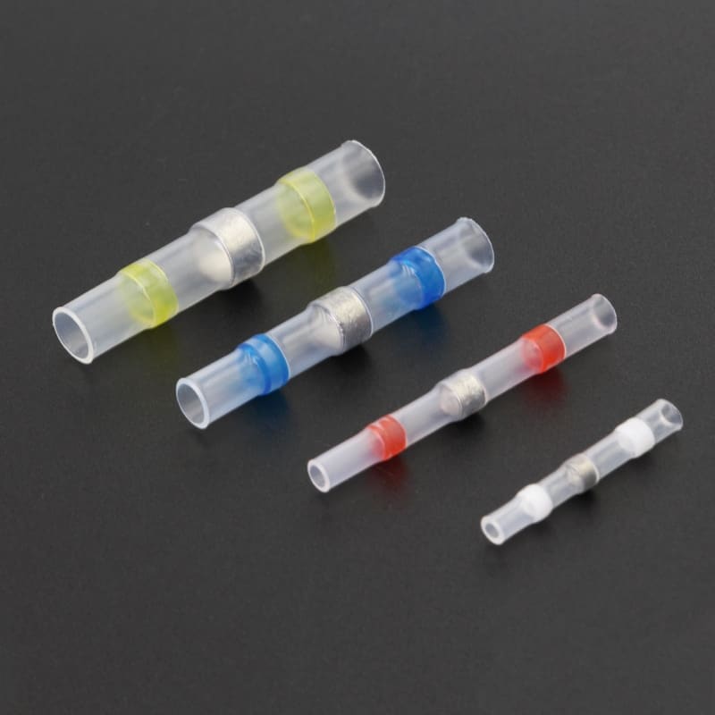 Ütközős összekötő, a közepében forrasztóónnal. Hevítés következtében az ón megolvad és így biztos érintkezést garantál. Ezenkívül az összekötő belső ragasztóval zsugorodik és így gondoskodik a vízállóságról.