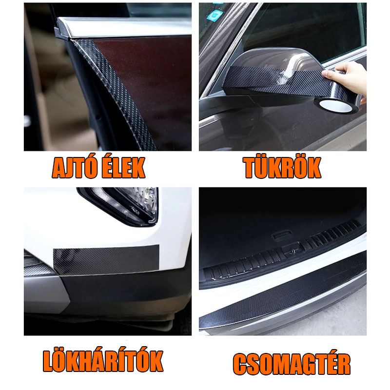 A karbon csík anyaga nem sima fólia, hanem vastagabb műgyanta jellegű. Így a nagyobb ütésektől is megvédi az autó elemeit.