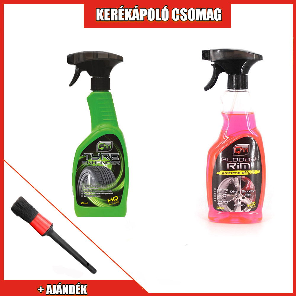 A kerékápoló csomagunk tartalmaz egy Bloody felnitisztító sprayt egy Q11 gumiápoló sprayt és egy ajándék felni tisztító ecsetet.
