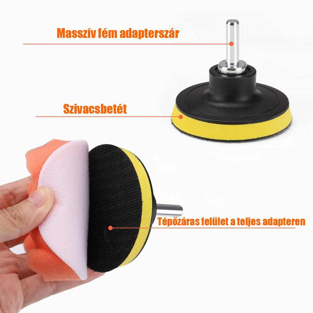 Az adapter teljes felületén tépőzárral van ellátva, így a korongok stabilan rögzülnek, nem tudnak munka közben lejönni. A cseréjük egyetlen mozdulat, így nem kell a szétszereléssel bajlódni a polírozókorong csere alkalmával.
