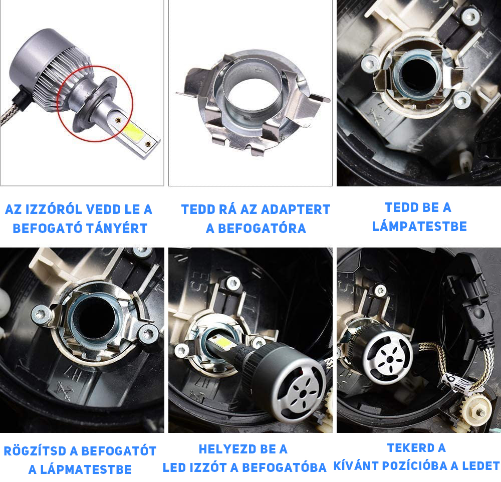 A led adapterek lehetővé teszik, hogy a hagyományos izzótól eltérő kialakítású ledeket is be lehessen rakni a lámpatestekbe. Az adapterek kialakítása speciálisan a H7-es foglalathoz illeszkedik, így a LED izzók egyszerűen és biztonságosan behelyezhetőek.