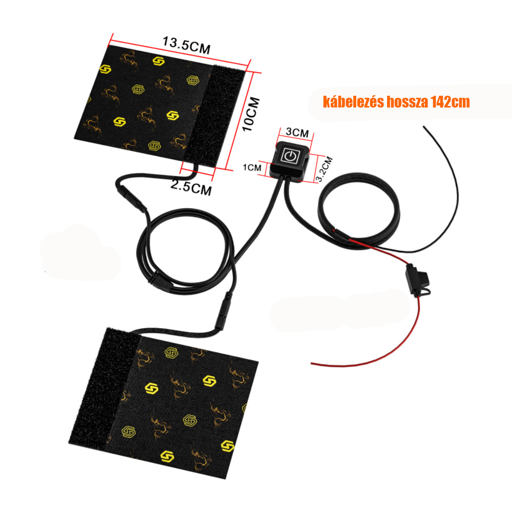 A kábelezés hossza 142cm. A fűtőpanel méretei a képen láthatóak. A szélességes 10cm, hossza 13.5cm így szinte minden markolatra kényelmesen felrakható.