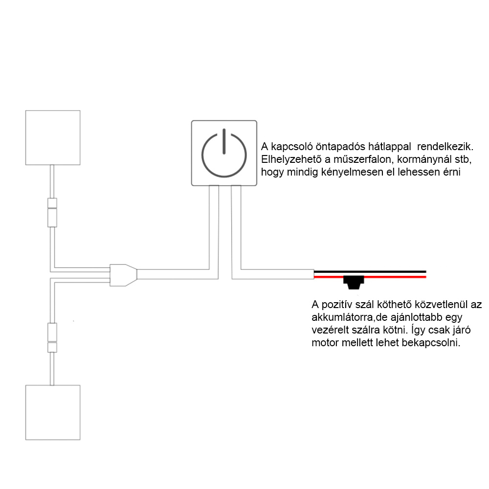 A bekötése történhet közvetlenül az akkumlátorra(pozitív-negatív pólusra.) mivel biztosítékkal és kapcsolóval van ellátva. Az ajánlott bekötés viszont egy vezérelt szálra való bekötés. Így csak járó motor mellett tud bekapcsolni a markolat fűtés. Így nem tudja lemeríteni az akkumlátort.