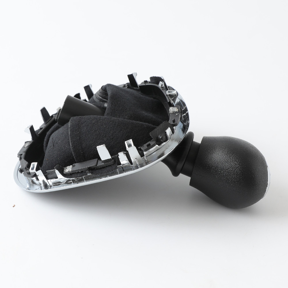 A váltószoknya fekete színű fekete varrással. Kompletten a beépítőkerettel össze van szerelve, így nagyon egyszerű a cseréje. A szoknya anyaga  műbőr, mint a gyári váltószoknyáké. A külső króm keretet is tartalmazza a szett.