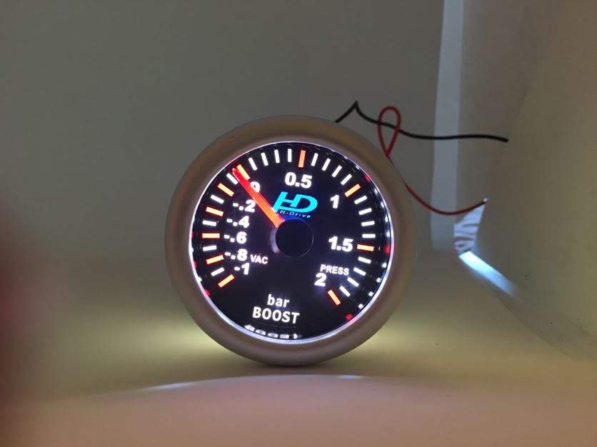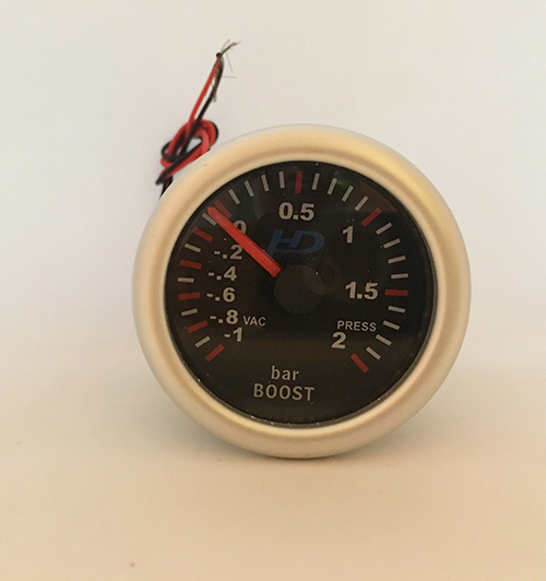 Fekete számlapos turbónyomás mérőóra, fehér led háttérvilágítással. 2Bar nyomásig van kalibrálva.
